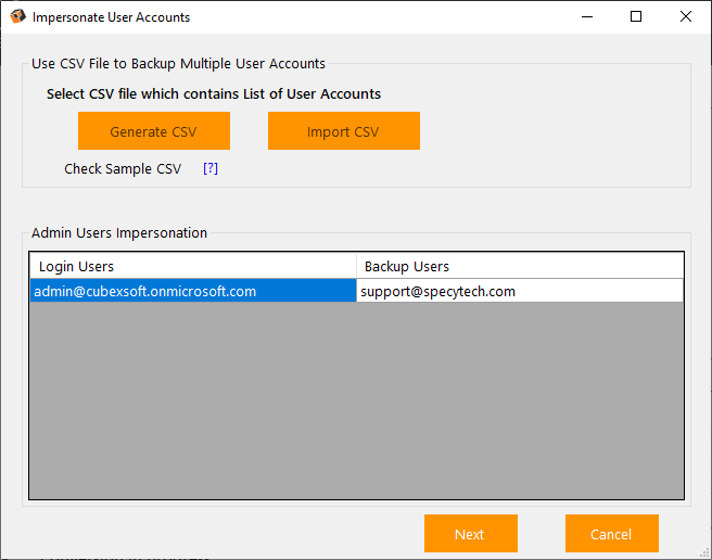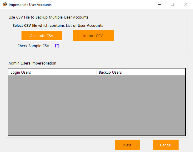 The software will open a new Impersonate User Accounts window and prompts you to generate CSV file containing user accounts.