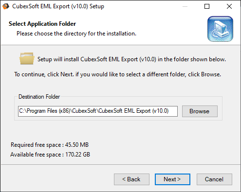 In the next window, you will be prompted to browse the location where you want to save the application folder. The default location of software application folder is C:\Program Files (x86)\CubexSoft EML Export(v10.0). Click Next to move further.