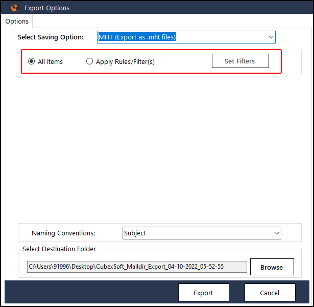 Software allows you to convert all Maildir items to MHT files. Additionally, you can also convert selective items by selecting the Apply Rules/Filters option.
