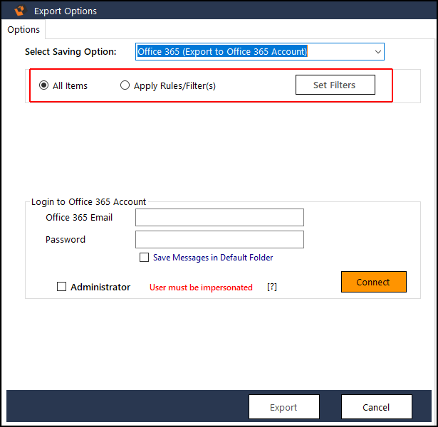 Software allows you to convert all Maildir items to Office 365 Account. Additionally, you can also convert selective items by selecting the Apply Rules/Filters option.