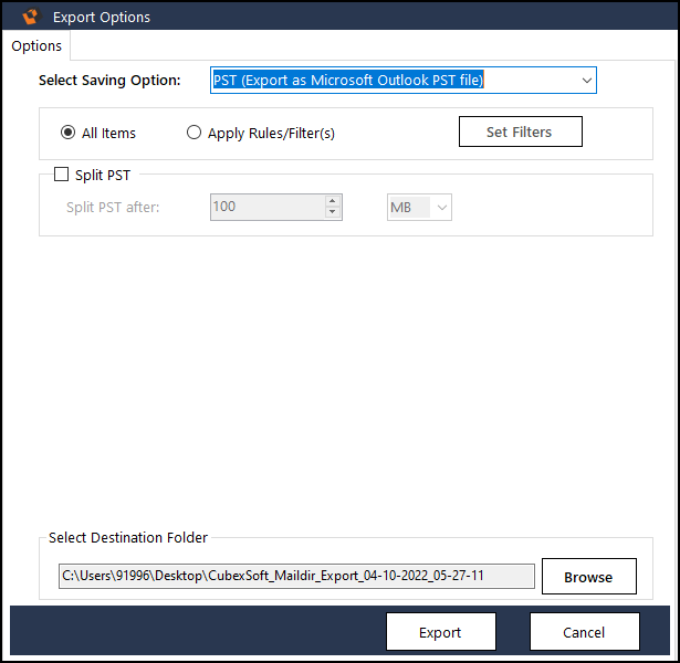 Software allows you to convert all Maildir items to PST file. Additionally, you can also convert selective items by selecting the Apply Rules/Filters option.