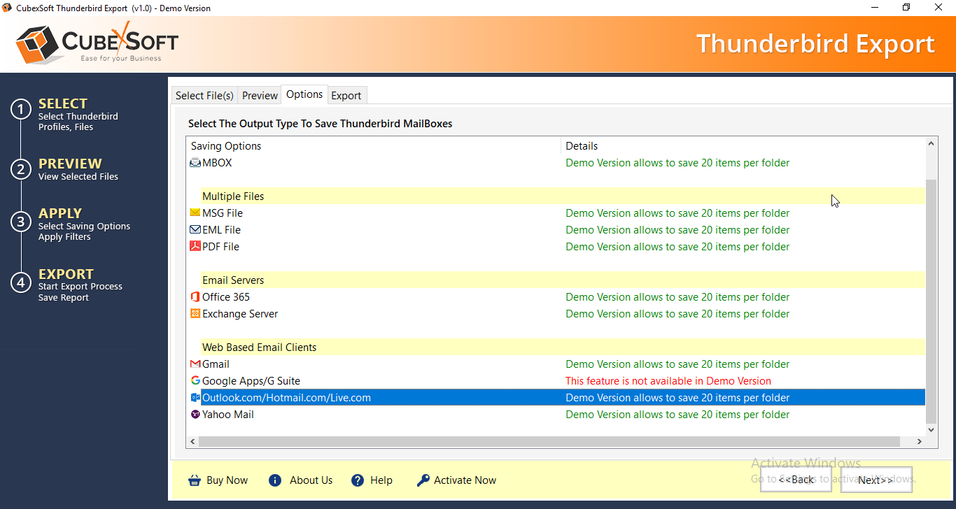For exporting Thunderbird database to Hotmail, select Hotmail from Select Output Type options. Click Next button to continue