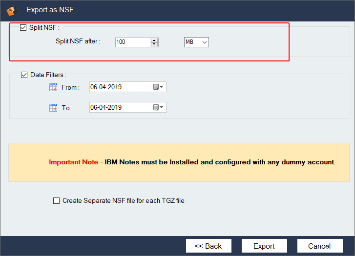 Next, select the checkbox appearing next to "Split NSF" option, to select the size in MB or GB after which the NSF file will be splitted.