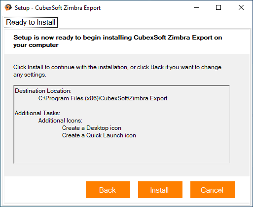 In the next window, you will be prompted to browse the location where you want to save the application folder. The default location of software application folder is C:\Program Files (x86)\CubexSoftZimbra Export. Click Next to move further.